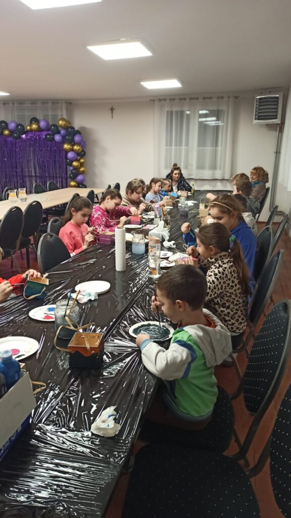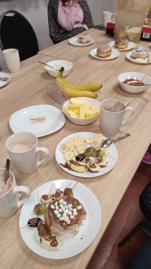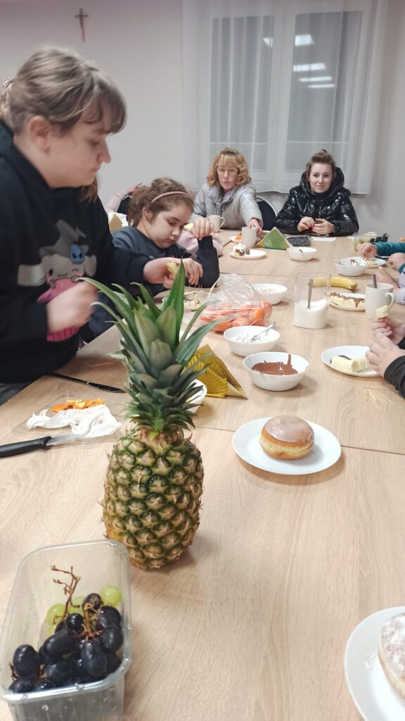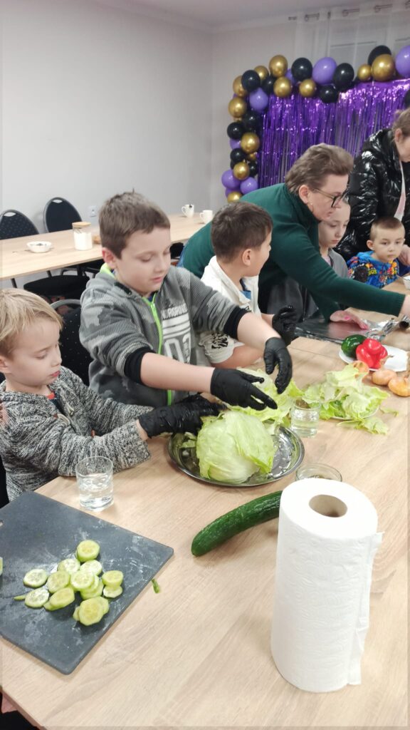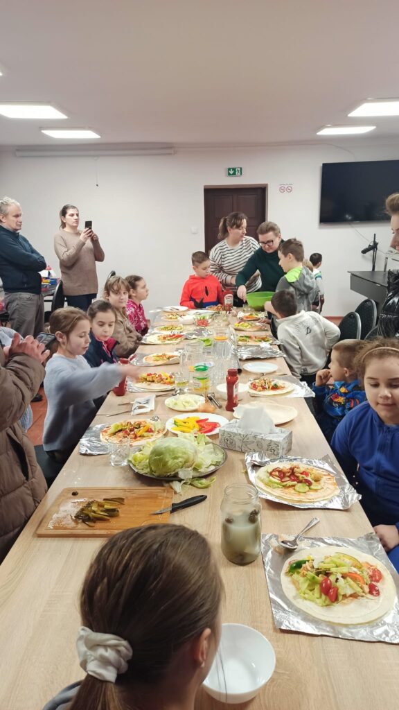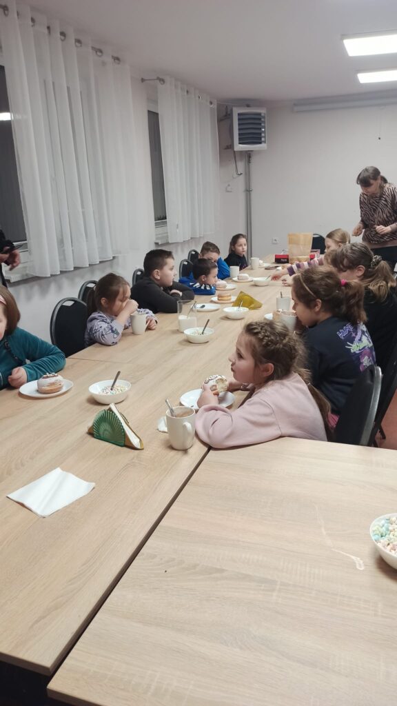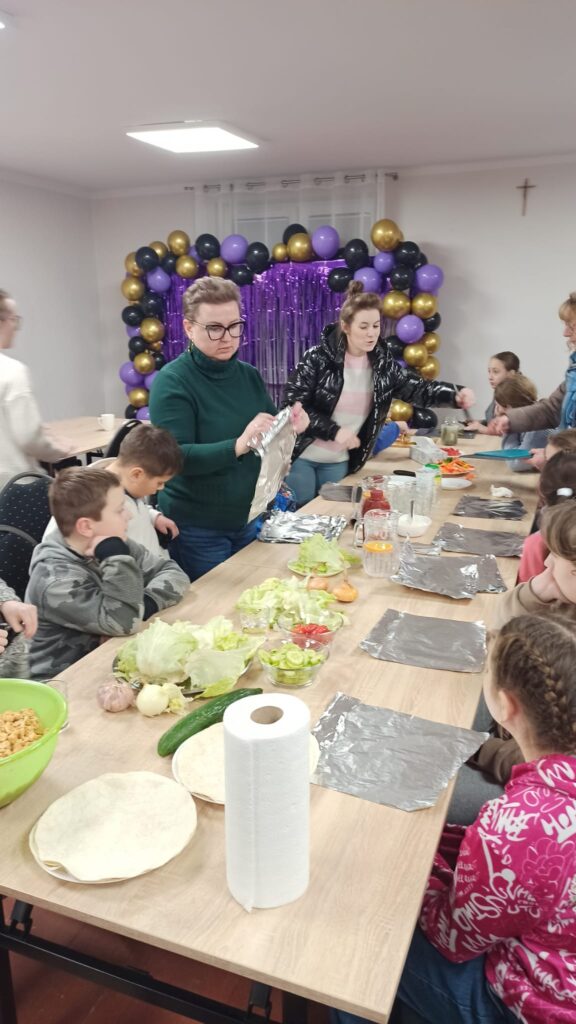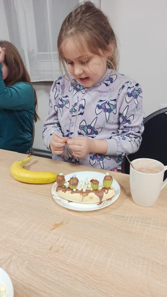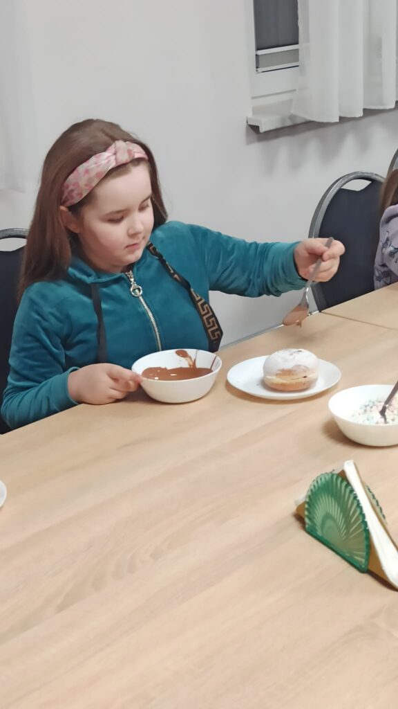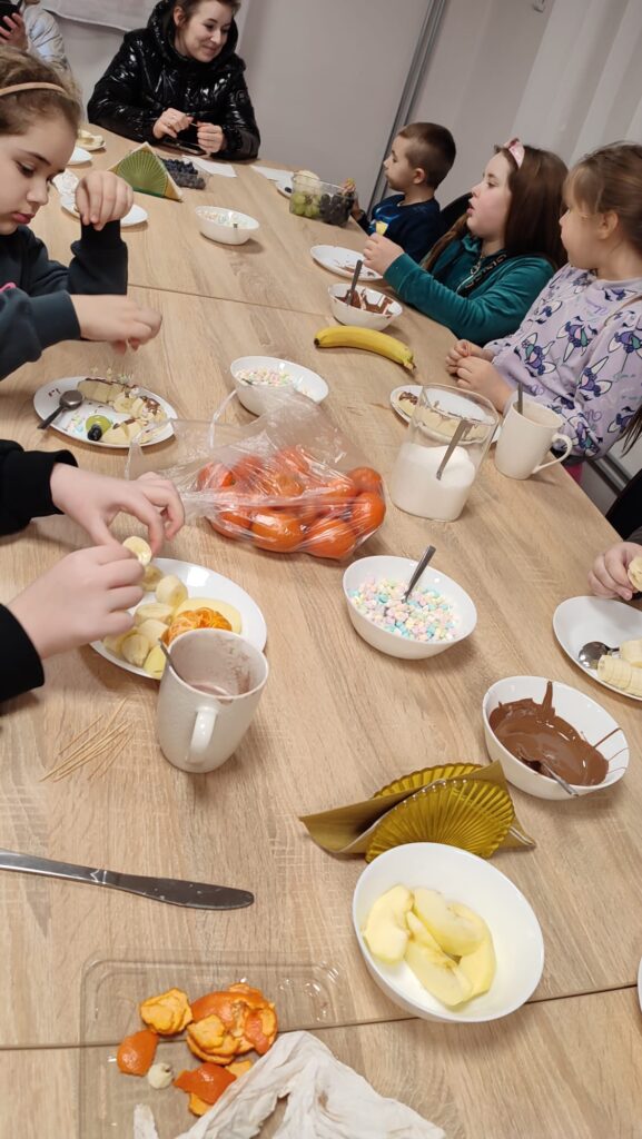 W programie znalazły się warsztaty kulinarne, podczas których uczestnicy przygotowywali domowego kebaba – od podstaw, z wielkim zaangażowaniem i apetytem. Ogromnym zainteresowaniem cieszyły się także warsztaty cukiernicze. Dzieci samodzielnie tworzyły desery owocowe w czekoladzie oraz pyszne, czekoladowe pączki. Nie zabrakło również słodkiej chwili relaksu przy kubku aromatycznego kakao z piankami.