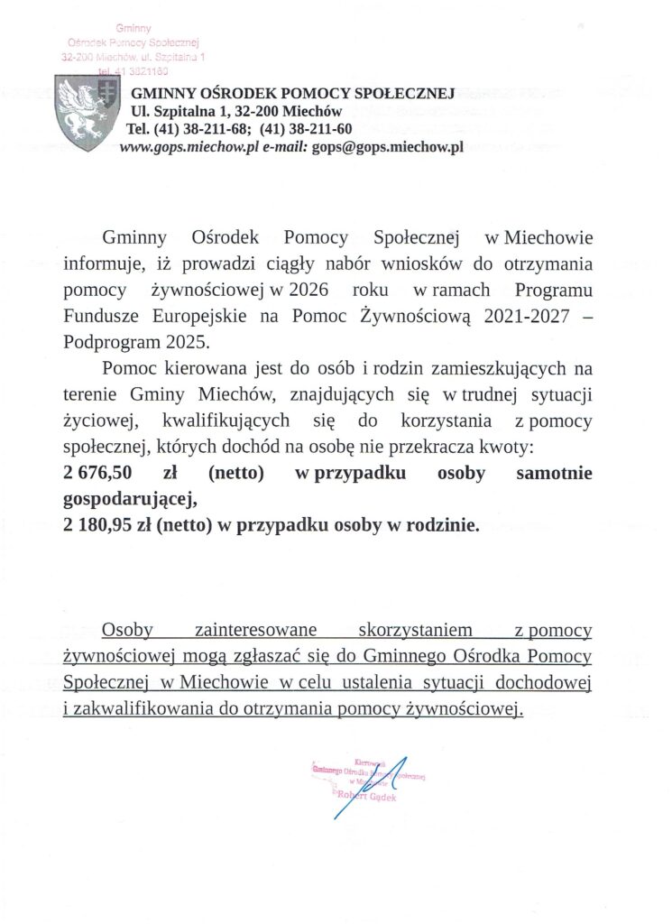 Gminny Ośrodek Pomocy Społecznej w Miechowie informuje o prowadzeniu ciągłego naboru wniosków o otrzymanie pomocy żywnościowej w ramach Programu Fundusze Europejskie na Pomoc Żywnościową 2021-2027 – Podprogram 2025.