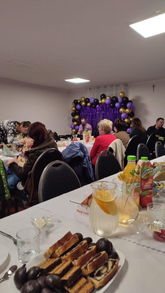 Na uczestników czekały również gorące napoje – aromatyczna herbata oraz czekolada, idealne na zimowe popołudnie. Nie zabrakło także tradycyjnych potraw, takich jak barszcz i pierogi, które podkreśliły świąteczny charakter spotkania.